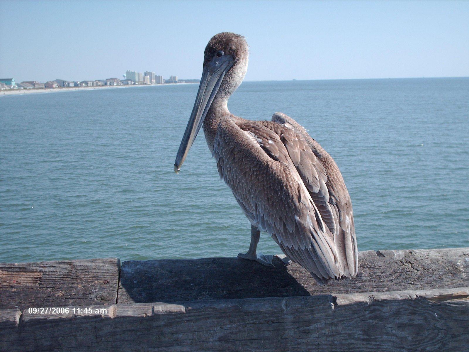 Pelican sitting on handrail of Cherry Grove Fishing Pier in North Myrtle Beach in South Carolina.