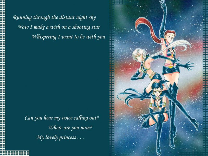 Yaten, Seiya, and Taiki aka The Sailor Starlights, with some of the lyrics to their song called "Search For Your Love".