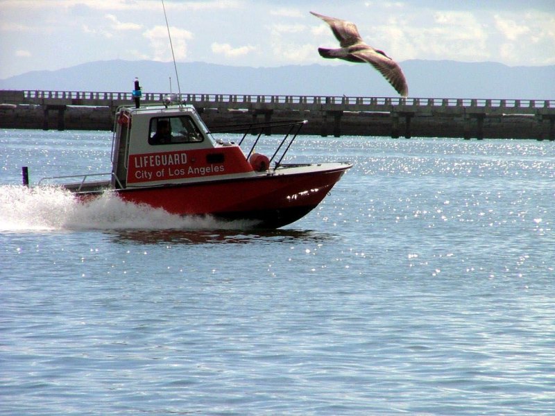 bird races boat in LA harbor
