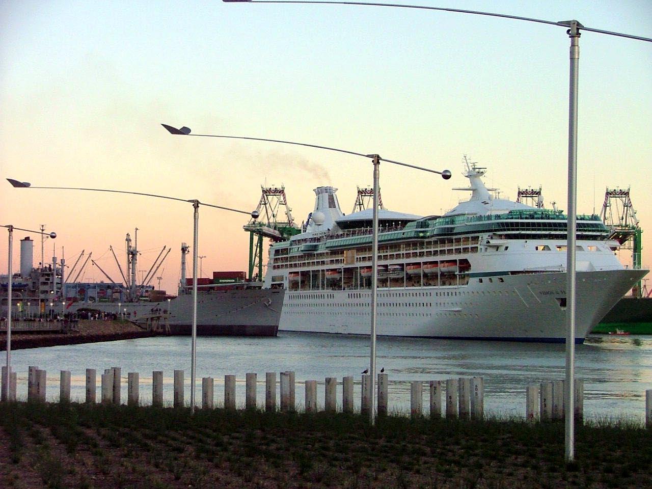 thats the Royal Carribean..the smaller ol navy ship is a museum..SS Lane Victory!