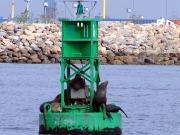 a gang of harbor seals take up a spot on a buoy to see the funny humans